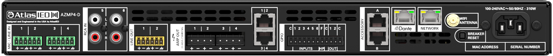 The Atmosphere AZMP4-D is a powered (600 Watt) 4-zone audio processor and the heart of an Atmosphere audio control system. Powerful DSP combined with innovative algorithms offer custom solutions for a wide variety of spaces. Dante networked audio provides convenient audio distribution to other Dante-enabled devices. A built-in message player, virtual wall controllers, learning ambient noise sensing, Tilter Filter™, auto-gain, GPIO, bell scheduler, room combine, and many more features, make the AZMP a processing powerhouse.